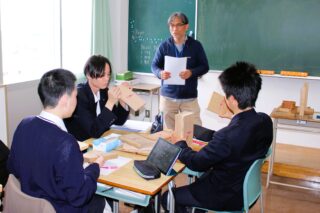 4月23日(木)、科学技術科デザインコース3学年「課題研究」の授業の一環として、東北工業大学 長町キャンパスにある木工所から講師をお招きし、木材の特徴や基礎を学ぶ授業を実施しました。参加した生徒は「空間に作用する木製照明」をテーマに活動しており、本授業は、制作に向けて木材への理解を深めることを目的としています。