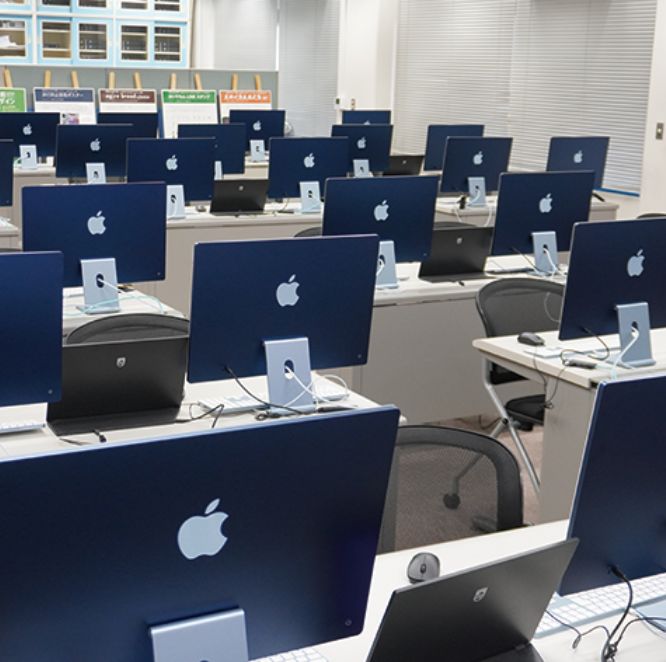 JOHNAN CREATIVE ROOMと名付けたJCRには、42台のMacPCがあり、MacとWindowsの両方のOSが搭載されています。Word・Excelはもちろん、IllustratorやPhotoshopを用いて実習を行っています。