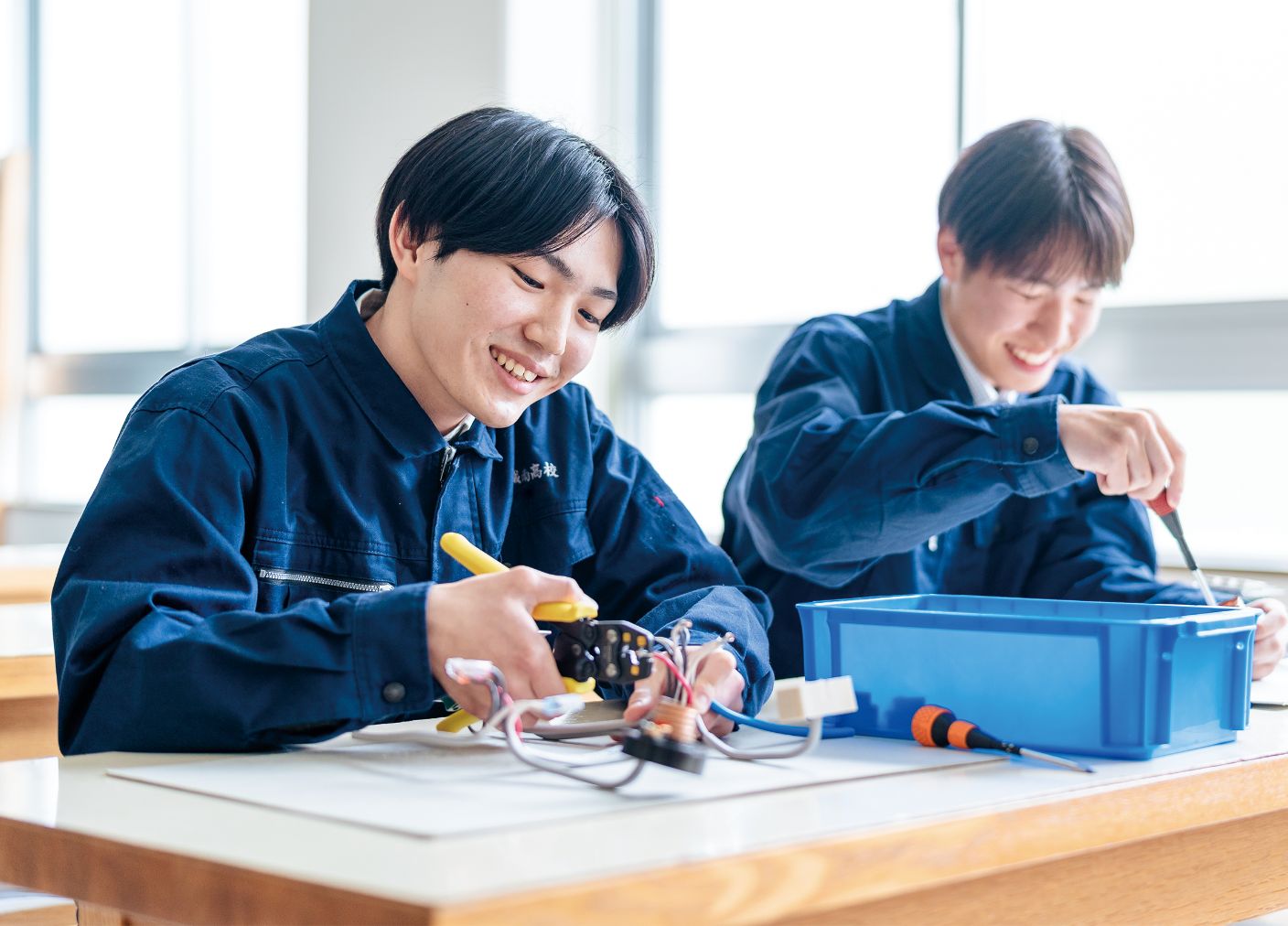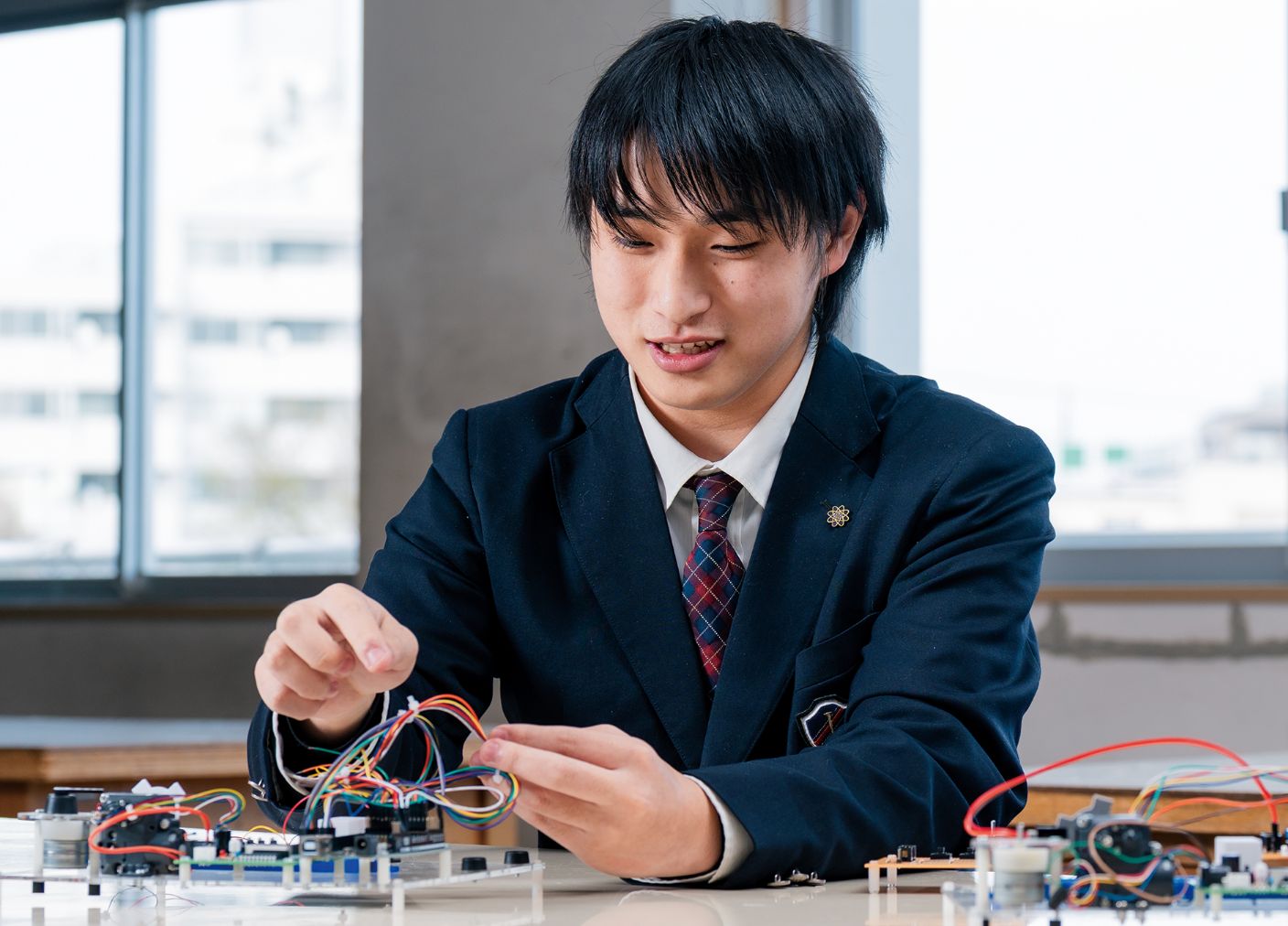 工学分野の中でも、電気・電子・情報と幅広い分野を学習。電子技術とプログラミングを学ぶことで、電子機器や工業製品を製作する現場で活きる知識と技術を習得します。
