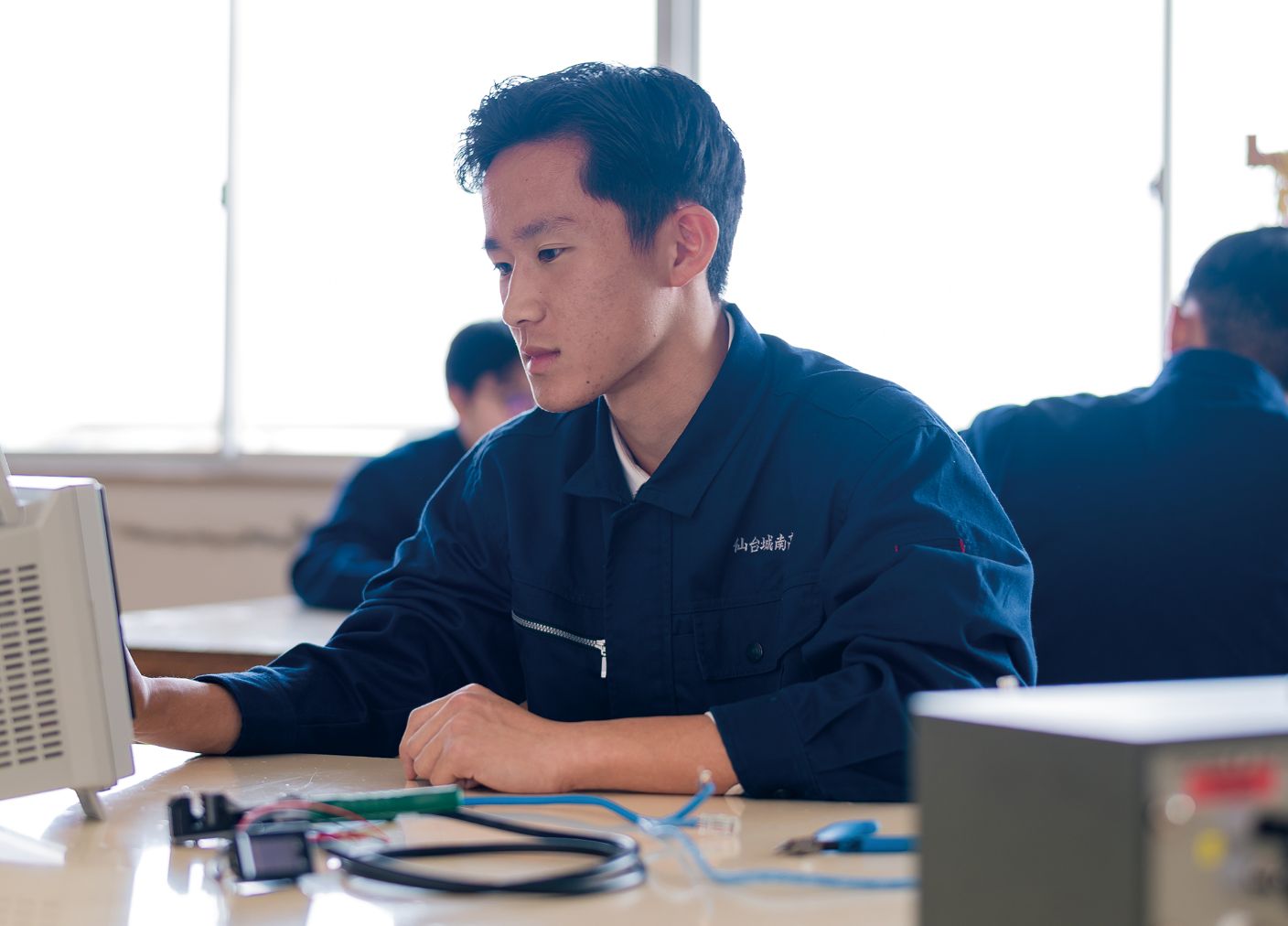 科学技術科の伝統は、県内有数の資格取得実績と取得サポートの充実が証明しています。大学進学に強いカリキュラムと授業、東北工業大学との連携した学習、外部専門家による出前授業の実施が、実践力を高める学びにつながっています。また、就職率の高い東北工業大学への進学により、興味・知識・技術の深化と拡大へと発展させます。社会に有益な人材として、自信をもって送り出します。