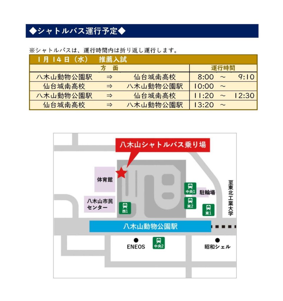 1月14日(水)に実施される推薦入試において、地下鉄東西線八木山動物公園駅と本校間の無料シャトルバスを下記の通り運行します。十分に台数等準備しておりますが混み合うことも予想されるので、時間に余裕を持ってご活用ください。