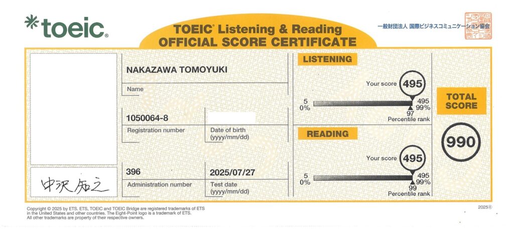 英語を担当する中沢知之先生がTOEICで満点の990点をとりました。
