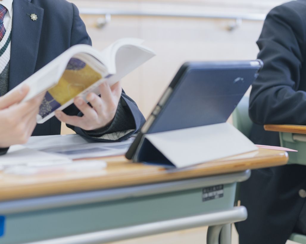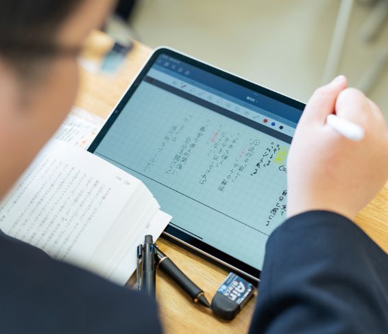 スキルを高めるICT技術を通じて探究し、自己表現できる手段を早い段階から身に付けることは、これからを生きる上で重要なテーマです。高度化する情報社会に対応できる「情報活用能力」を養うために、本校では授業のみならず先生や生徒間での連絡機能としてもタブレット等を活用しています。